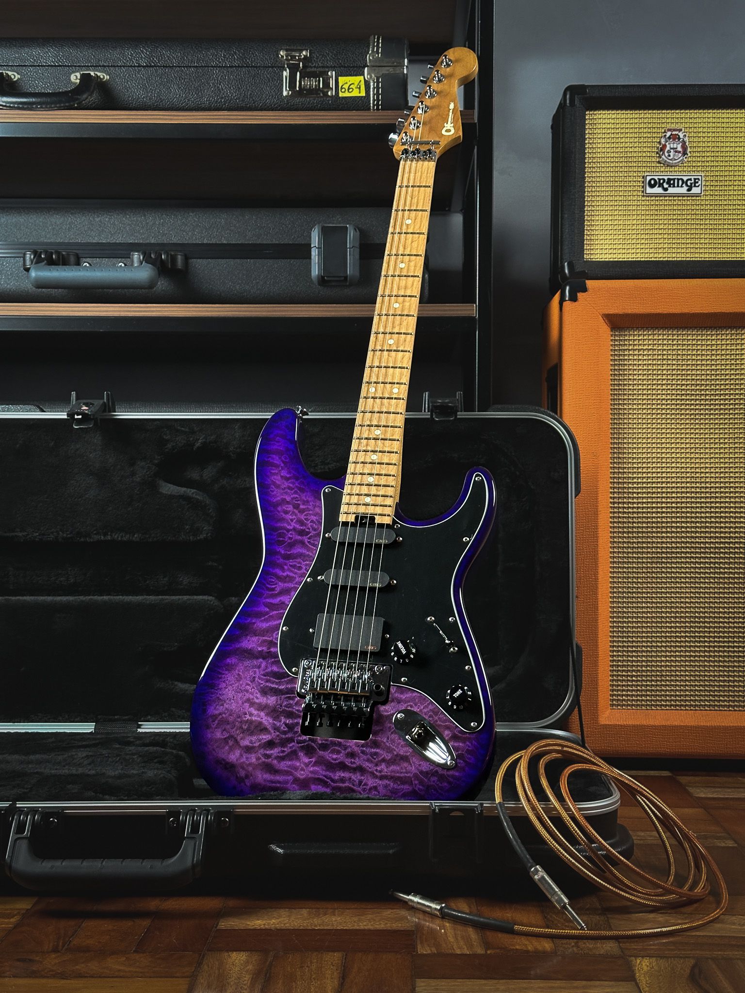 O corpo de alder do instrumento tem um topo de maple quiltado ondulado e contornos esculpidos para acesso confortável aos trastes superiores. O braço parafusado de roasted maple, com reforço de grafite e acabamento acetinado, oferece durabilidade e sensação de antiguidade, além de pontos laterais Luminlay® e ajuste do tensor no calcanhar. A escala de roasted maple com raio composto de 12"-16" proporciona conforto nos acordes e velocidade nos solos, com 22 trastes jumbo e bordas arredondadas. A configuração HSS conta com captadores EMG® 89 na ponte e EMG® SA no meio e braço, oferecendo versatilidade tonal. A ponte tremolo Floyd Rose® 1000 Series garante estabilidade de afinação. A guitarra tem acabamento Burst Roxo Transparente, escudo preto e hardware cromado, com headstock Fender® Strat® licenciado.