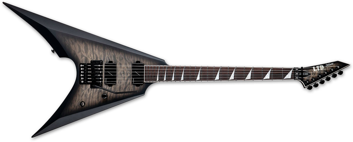 Como parte da série LTD Deluxe projetada para músicos profissionais, a LTD ARROW-1000 oferece mais do que você esperava. Ela oferece construção set-thru, o que significa que o braço se estende profundamente na cavidade do corpo da guitarra, oferecendo acesso incomparável aos trastes superiores. Possui corpo em mogno com acabamento Charcoal Cherry Burst Satin. Ela também possui o braço de maple "extra thin U" shape e uma escala em ébano com 24 trastes extra-jumbo em aço inóx. A ARROW-1000 leva seu som para um outro nível, com o conjunto de captadores ativos Fishman Fluence Modern Humbucker para tons que vão de limpos cristalinos, a timbres muito agressivos. Finalmente, a ponte Floyd Rose 1000SE em conjunto com as tarraxas Groover, garantem uma afinação precisa e estável.