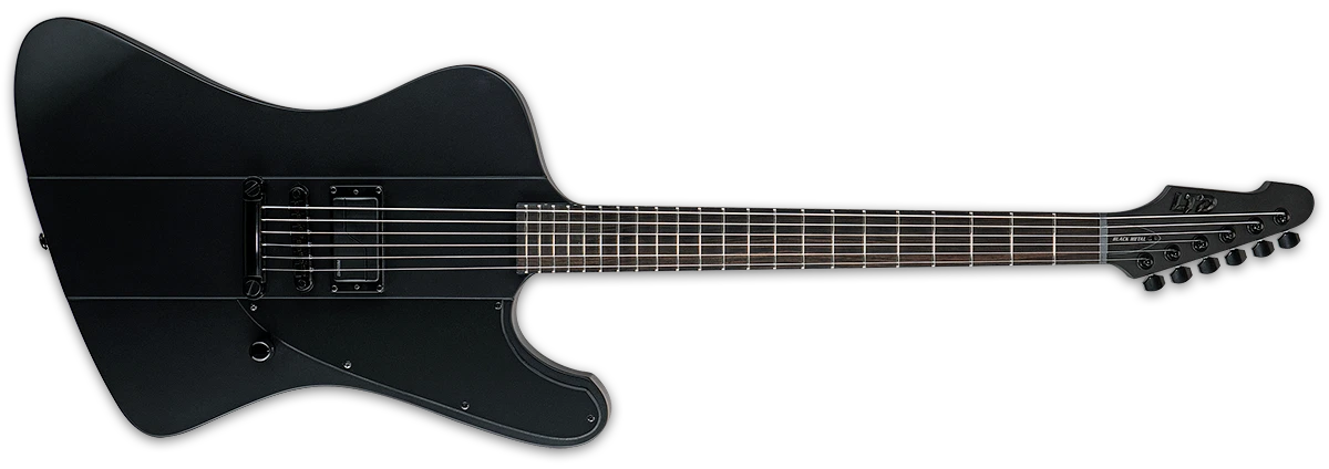 A LTD Black Metal Series reúne guitarras com nível de construção comparável à linha LTD Deluxe 1000 Series, porém com uma estética sombria e agressiva. O conceito Black Metal aposta em acabamento totalmente preto — incluindo ferragens e componentes — aliado a uma proposta minimalista: apenas um captador premium, escala em ébano Macassar sem marcações, com marcadores laterais que brilham no escuro, e até o logo LTD em black metal no headstock.