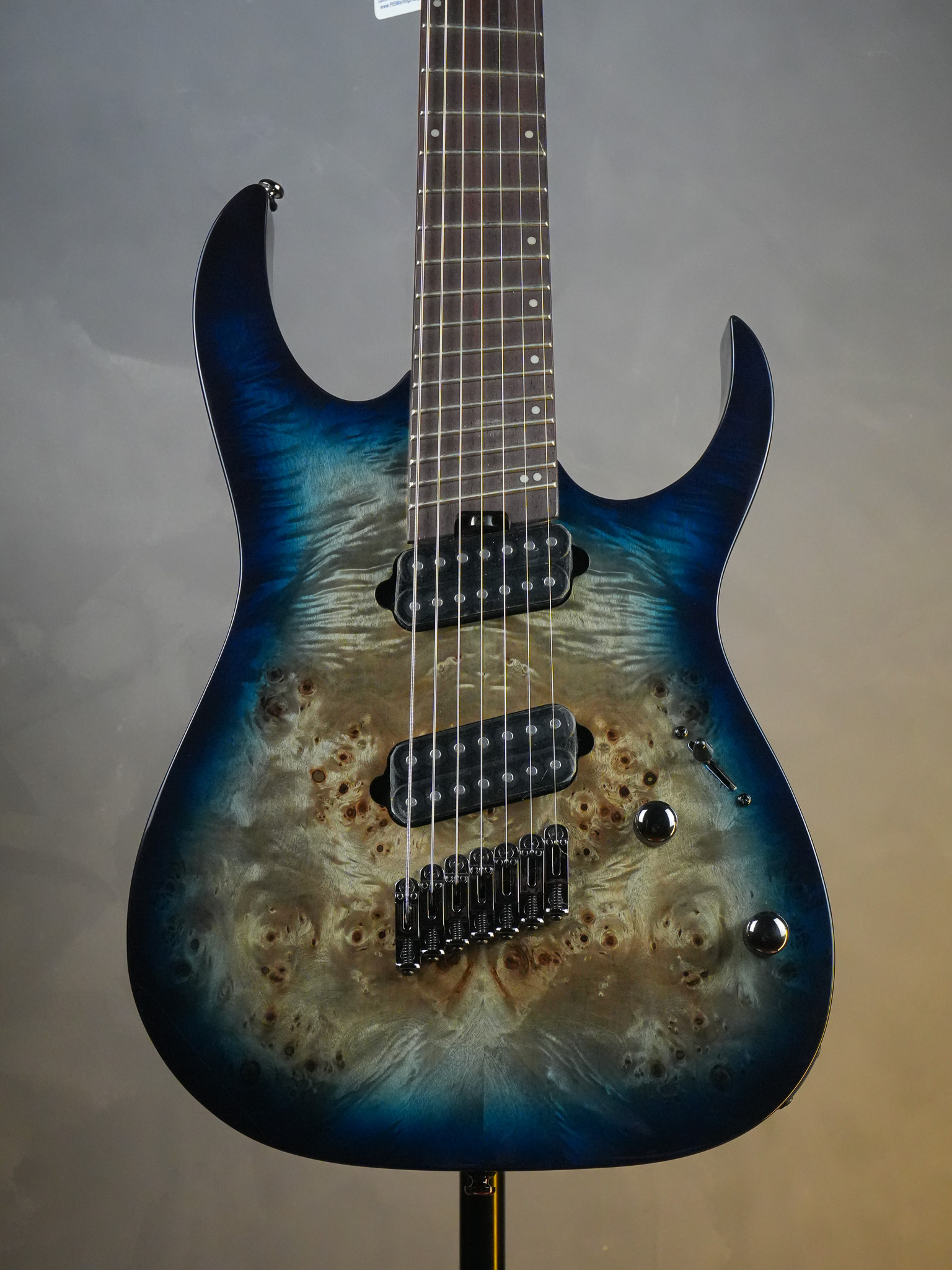 A Ibanez RGMS7PB-CBS é uma guitarra multiescala de 7 cordas que combina inovação, conforto e potência sonora. Seu corpo em nyatoh com tampo em poplar burl recebe o acabamento Cosmic Blue Star Burst, garantindo presença visual marcante. O braço Wizard III-7 multiescala, construído em 5 peças de maple/walnut, proporciona tocabilidade ágil e precisa, aliado à escala em jatoba com marcações White Step off-set dot inlay.